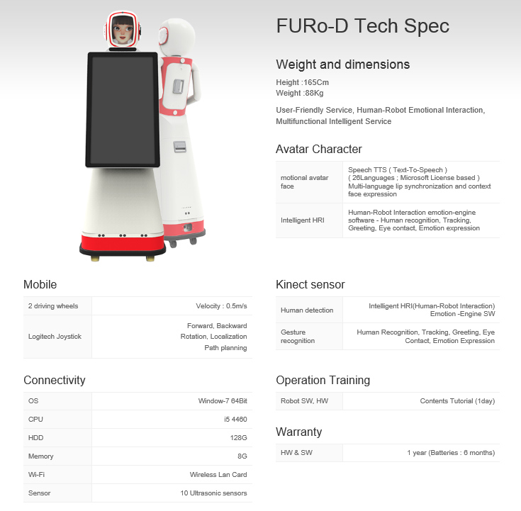 ‘퓨로-D’는 32인치 세로형 터치 모니터를 장착해 광고와 홍보가 가능하도록 설계된 광고·홍보용 로봇이다. 한국어, 영어, 중국어, 일본어 등 30여개의 언어를 이용해 서비스한다. 극장, 공항, 쇼핑몰, 백화점, 호텔, 테마파크 등 유동인구가 많은 곳에서 움직이는 안내 또는 광고매체로 사용할 수 있다.