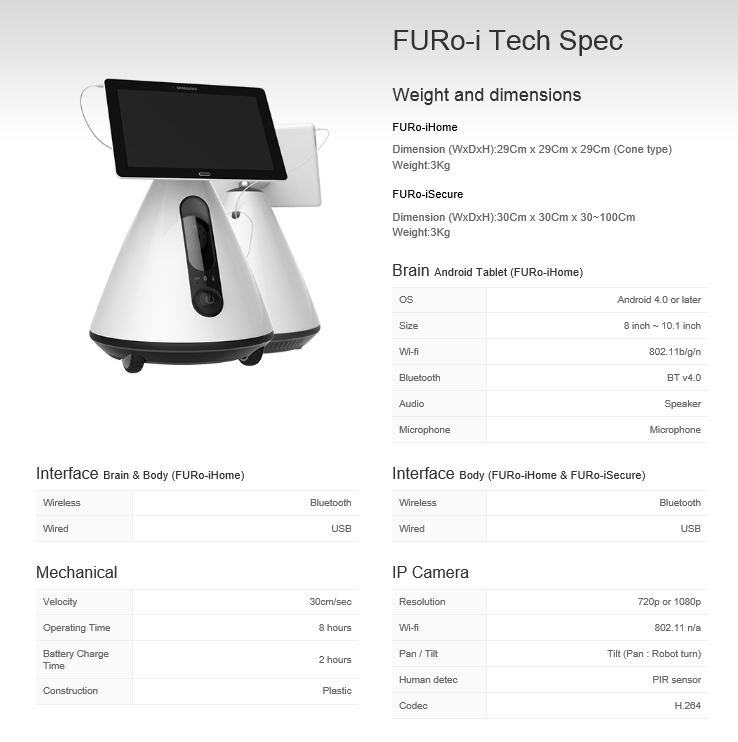 가정용 로봇인 퓨로-i 홈은 기존 범용 태블릿의 기본 기능과 로봇의 모바일, 감성 서비스 기술, IP카메라, 텔레프레즌스 기술을 접목하여 때로는 친구, 때로는 가정 돌보미가 되어 가족을 연결해주고 가정생활을 돌봐주는 홈케어 로봇이다. 가정용에 맞도록 소형화한 게 특징이다.